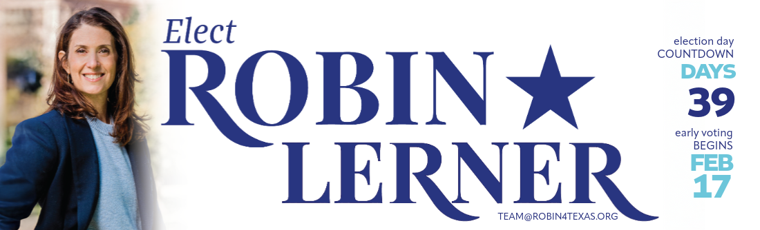 1/17 Northeast Travis County (NETCo) Candidate Forum: None of us attended this one, but we heard Robin made a splash at La Palapa Restaurant where the forum was held. It was a good turnout and she got to talk to some voters she doesn't typically reach in the northern edge of her district.